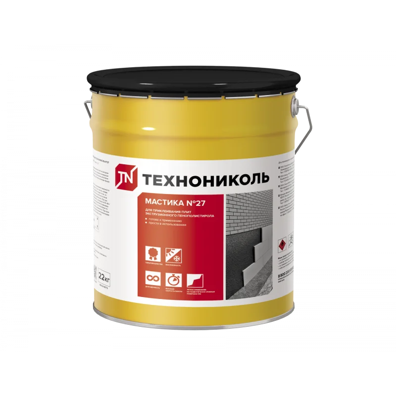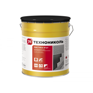 Мастика приклеивающая ТЕХНОНИКОЛЬ № 27 представляет собой многокомпонентную однородную массу, состоящую из битума, минерального волокна, минеральных наполнителей, растворителя и технологических добавок. Мастика приклеивающая ТЕХНОНИКОЛЬ № 27 предназначена для приклеивания плит из экструзионного пенополистирола к битумным, битумно-полимерным изоляционным материалам, а также к бетонным поверхностям в системах изоляции фундаментов.