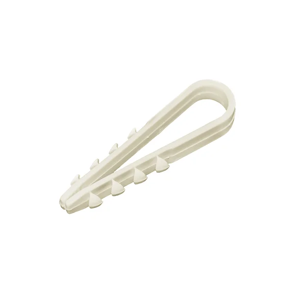 Дюбель-хомут надевается на провод и вставляется в просверленное отверстие. Он плотно фиксирует провод в нужном положении, предотвращая его смещение и создавая надёжное крепление. Такие крепежные элементы особенно полезны при прокладке электропроводки в стенах и потолках, а также при монтаже кабельных каналов.