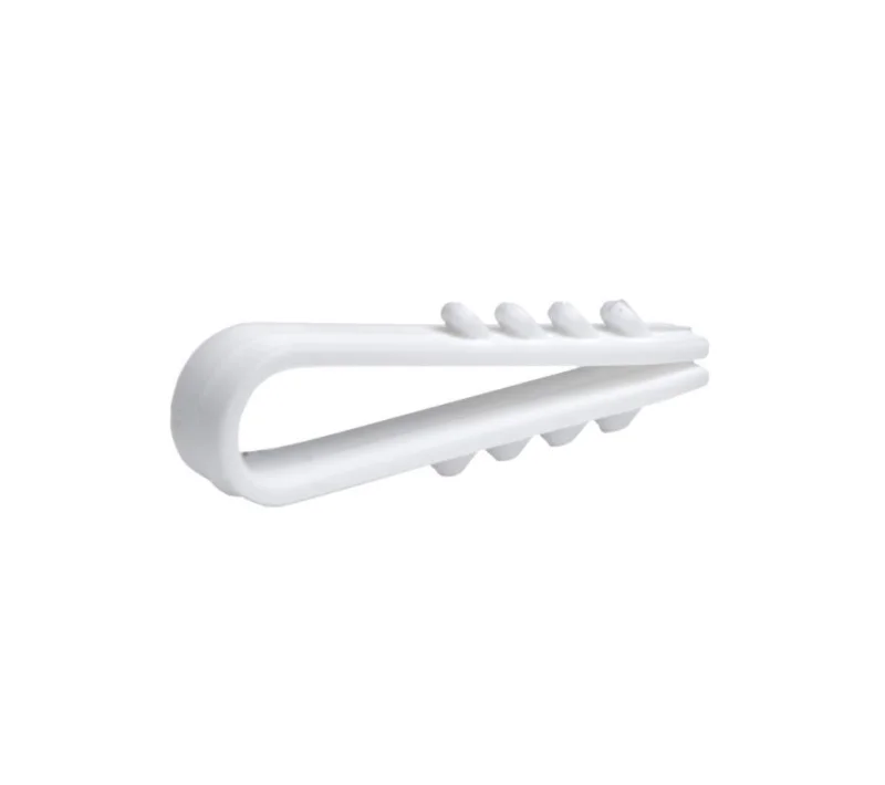 Дюбель-хомут надевается на провод и вставляется в просверленное отверстие. Он плотно фиксирует провод в нужном положении, предотвращая его смещение и создавая надёжное крепление. Такие крепежные элементы особенно полезны при прокладке электропроводки в стенах и потолках, а также при монтаже кабельных каналов.