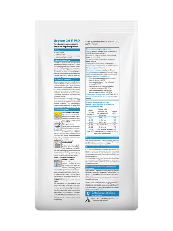 Клей СМ 11 предназначен для крепления керамических и каменных плиток с водопоглощением не менее 3% и размером до 40х40 см на недеформирующихся минеральных основаниях (таких как бетон, цементные стяжки, цементные и цементоизвестковые штукатурки), на стенах и полах вну три и снаружи зданий, включая помещения с постоянной влажностью.