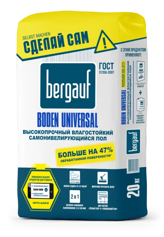 Расход смеси Bergauf Boden Universal при слое 10 мм на 1 кв.м составляет всего 12-14 кг. Количество материала можете рассчитать по простой формуле <13 кгтолщина слоя в смплощадь комнаты в кв.м>. Если у вас в помещении большие перепады и есть участки, которые нужно заделать, не забудьте заложить это количество смеси в расходы.