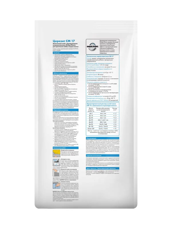 Клей СМ 17 предназначен для крепления всех видов минеральных плиток – керамических, керамогранитных, клинкерных, каменных (кроме мраморных) и т.п., на стенах и полах